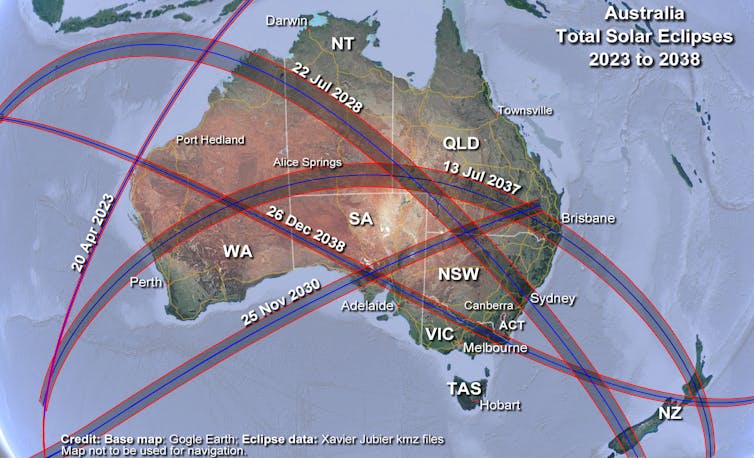 Totality will cross southern Western Australia, southern Northern Territory, western Queensland, and pass directly over Brisbane and the Gold Coast.