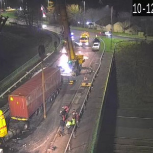 A major roundabout in Northern Ireland has been closed this afternoon after a lorry flipped over[1] on an approach road. The Tamnamore Roundabout on the M1 sits on the outskirts of Tamnammore/Coalisland in Co Tyrone[2] and just before Dungannon. Footage from Trafficwatch shows a red shipping container and yellow cab of the truck flipped over on a bridge over the M1 with no visible traffic on the motorway.