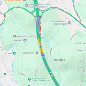 National Highways is reporting both lanes closed on the M1 southbound entry slip at junction J35 due to an "accident involving a vehicle that has left the carriageway". The event is currently expected to clear between 2:15pm and 2:30pm with normal traffic conditions returning around the same time. The M1 southbound between junctions J35 and J34 also currently has one of four lanes closed and there are currently delays of 30 minutes against expected traffic.